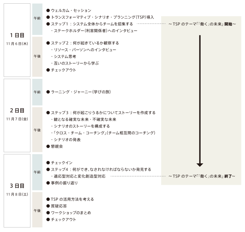 プログラムの特徴 ・3日間連続セミナーで集中的に学びます ・1日目午前と3日目午後は講義&質疑応答を実施します ・1日目午後~3日目午前はワークショップ形式を取り入れます ・TSPのプロセスを実際に体験します
