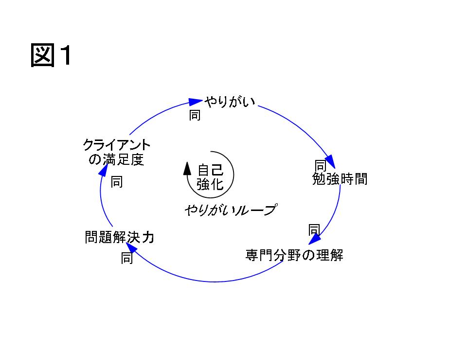 そんなある日、Aさんは新しい手法に出会います。その手法は、本質的な変化を創り出すのにとても有効なものでした。そこでAさんは、この手法を仕事に取り入れて活用し、好循環を作ろうと思いました。まず新しい手法を学ぶ「勉強時間」をとることで、「この専門分野の理解」が深まり、「問題解決能力」が向上し、「クライアントの満足度」が上がると、大きな「やりがい」を感じるようになるので、ますます新しい手法の「勉強時間」をとるようになる、という自己強化型ループです。「やりがいループ」といってよいでしょう(図1)。