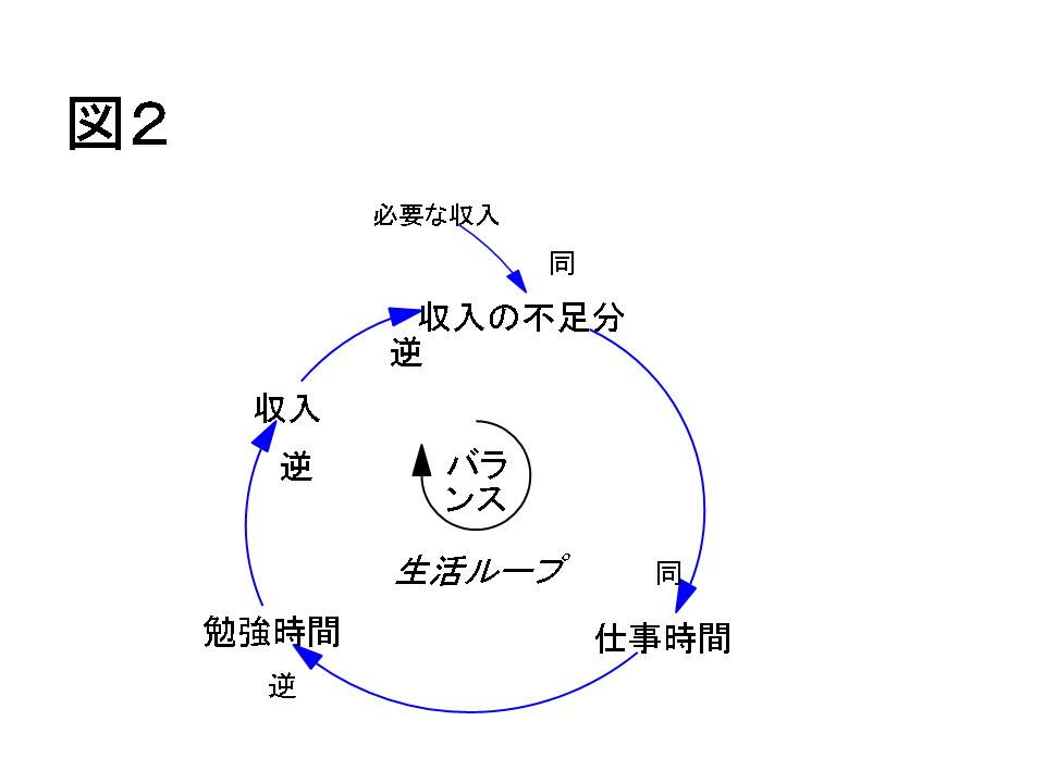 「収入の不足」が増えると、「これは大変だ。仕事をしなきゃいけない」となって、「仕事の時間」を増やします。ところが「総時間」は決まっていますから、「仕事時間」を増やすとどうしても「勉強時間」が減ってきます。このループはバランス型で「生活ループ」といえるでしょう(図2)。
