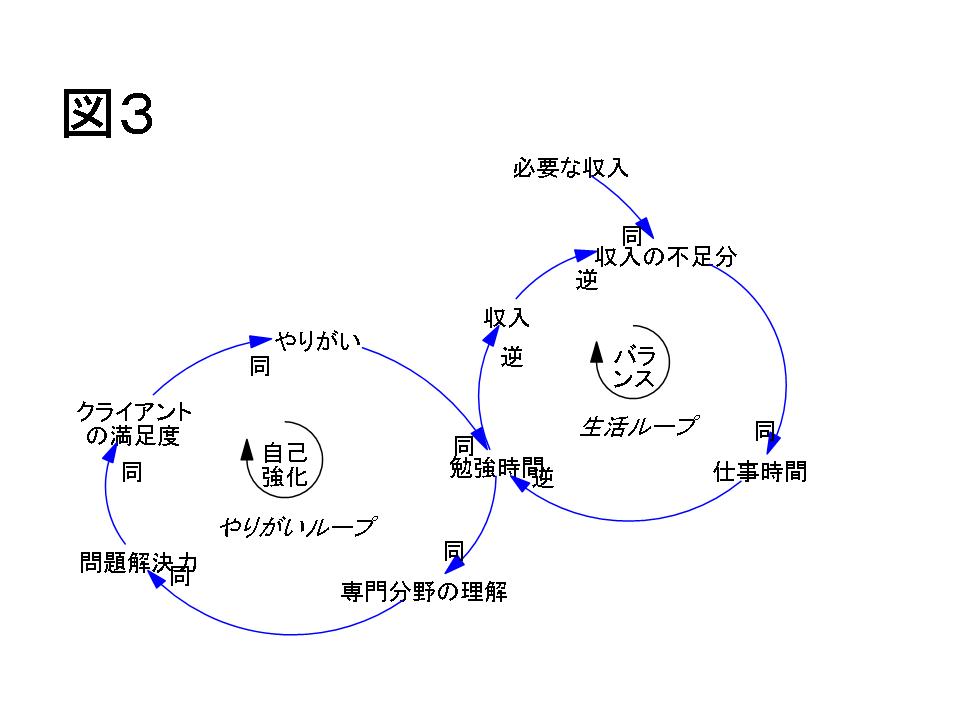 こうして、勉強したいなという気持ちがあって、「やりがいループ」を働かそうと思っても、収入が必要だという気持ちから「生活ループ」が働いて仕事をしてしまい、勉強を阻害する構図になっています。バランス型ループが働くために、なかなか自己強化型ループが回らない状況でした(図3)。