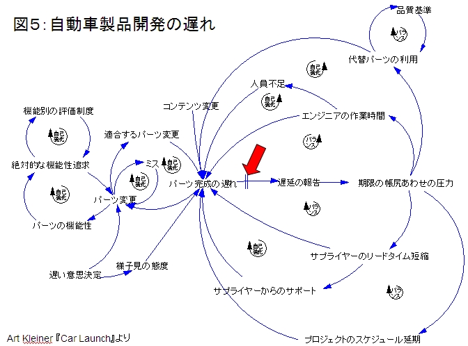 また、自動車業界ではフォードの開発会社が、システム思考、メンタルモデル、共有ビジョンなどを柱とする組織開発プログラム「学習する組織」を導入しました。システム思考を学んだ経営陣とマネージャーたちは、対話を通じて現実を生み出すシステム構造をあぶり出しつつ(図5)、チームの共有ビジョンを構築して同社の開発史に残るような製品開発を成し遂げました。プロジェクトは、通常の48カ月から6カ月短縮していた期限をさらに前倒しで達成し、コストは予算比80億円を節減、ほかのすべてのパフォーマンスターゲットも達成または超越しました。市場ではデザイン賞も得て、同社の開発史上もっとも高く評価される製品となりました。